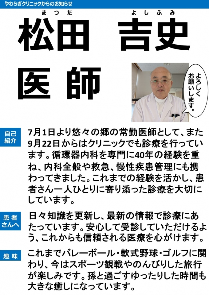 医師のご紹介 2025 12/25 やわらぎクリニック 医師紹介 2025年12月25日 毎週火曜日に外来診療を行います。よろしくお願いいたします。 やわらぎクリニック 医師紹介 よかったらシェアしてね! URLをコピーしました! URLをコピーしました! コメント コメントする コメントをキャンセルコメント ※ 名前 ※ メール ※ サイト 次回のコメントで使用するためブラウザーに自分の名前、メールアドレス、サイトを保存する。